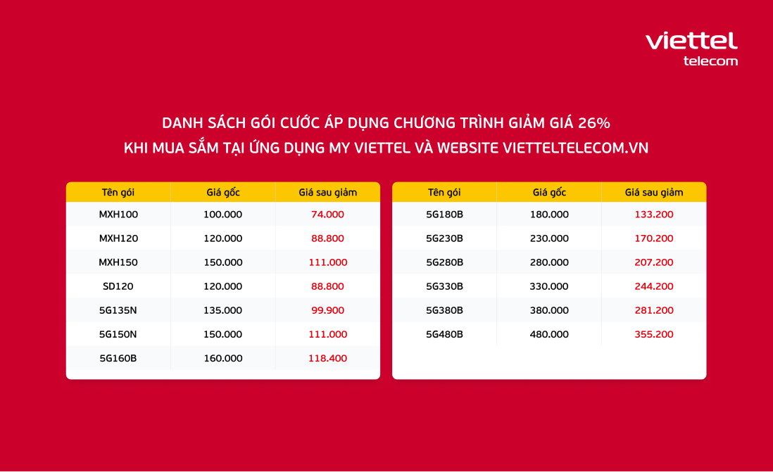 – Một số gói cước chỉ áp dụng cho thuê bao theo danh sách. Chi tiết danh sách các gói cước được áp dụng chương trình ưu đãi giảm giá 26% khi mua trên My Viettel và website Vietteltelecom.vn bao gồm: