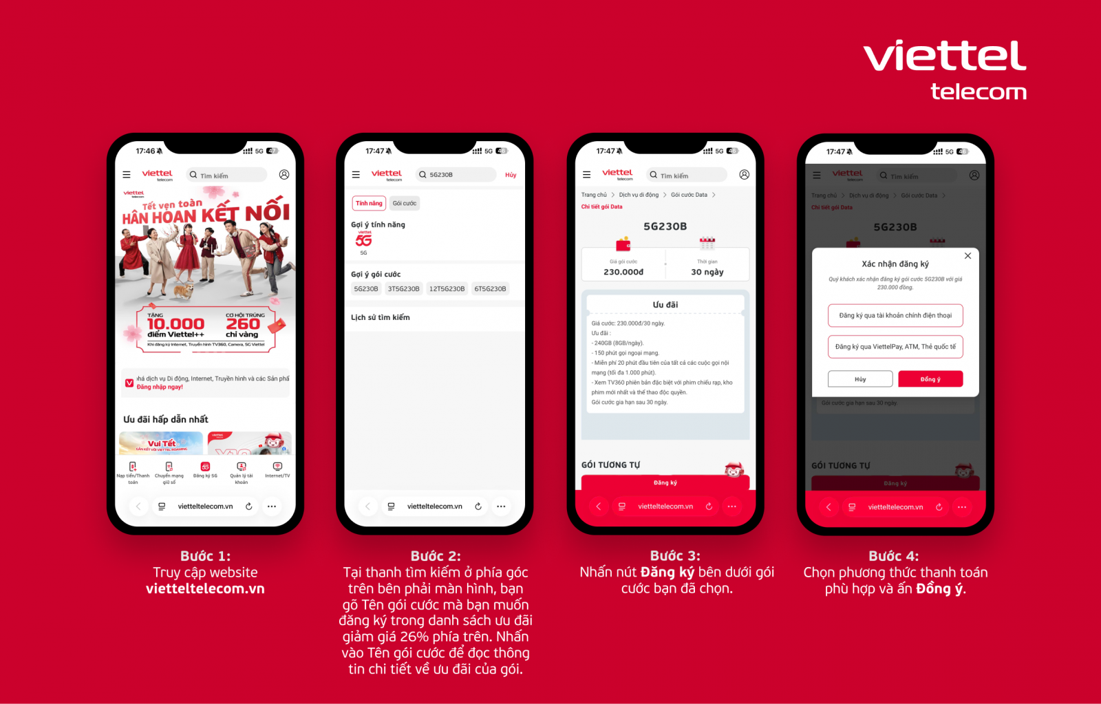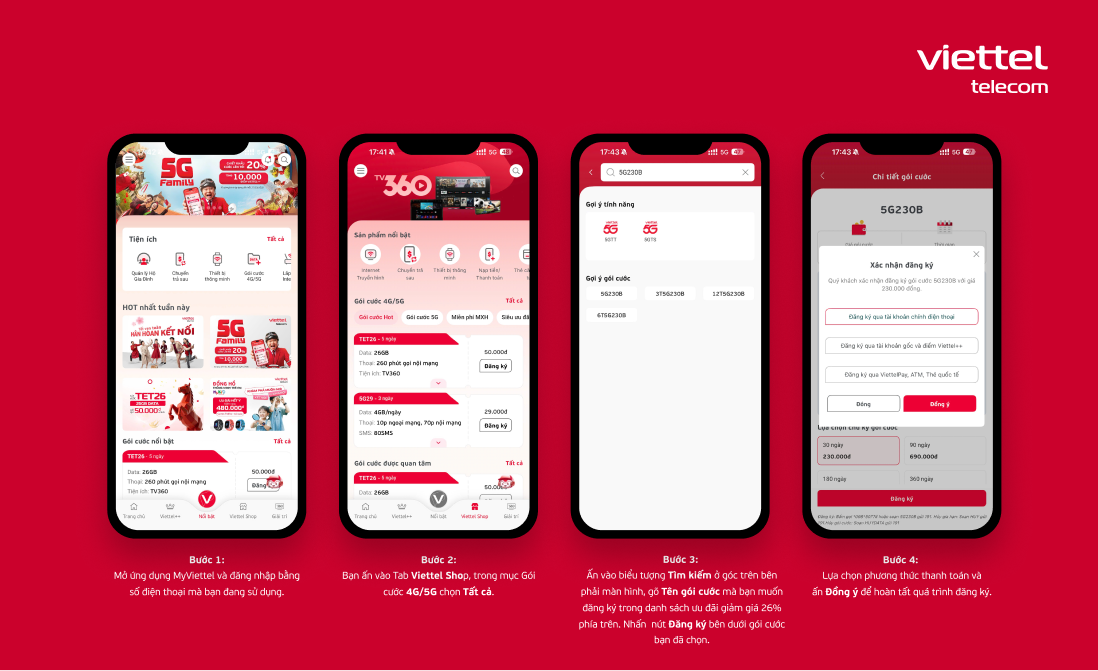Để nhận được ưu đãi, bạn chỉ cần đăng ký gói cước (trong danh sách) trên ứng dụng My Viettel hoặc website Vietteltelecom.vn từ ngày 23/02/2026 – 03/03/2026. Dưới đây là hướng dẫn chi tiết.